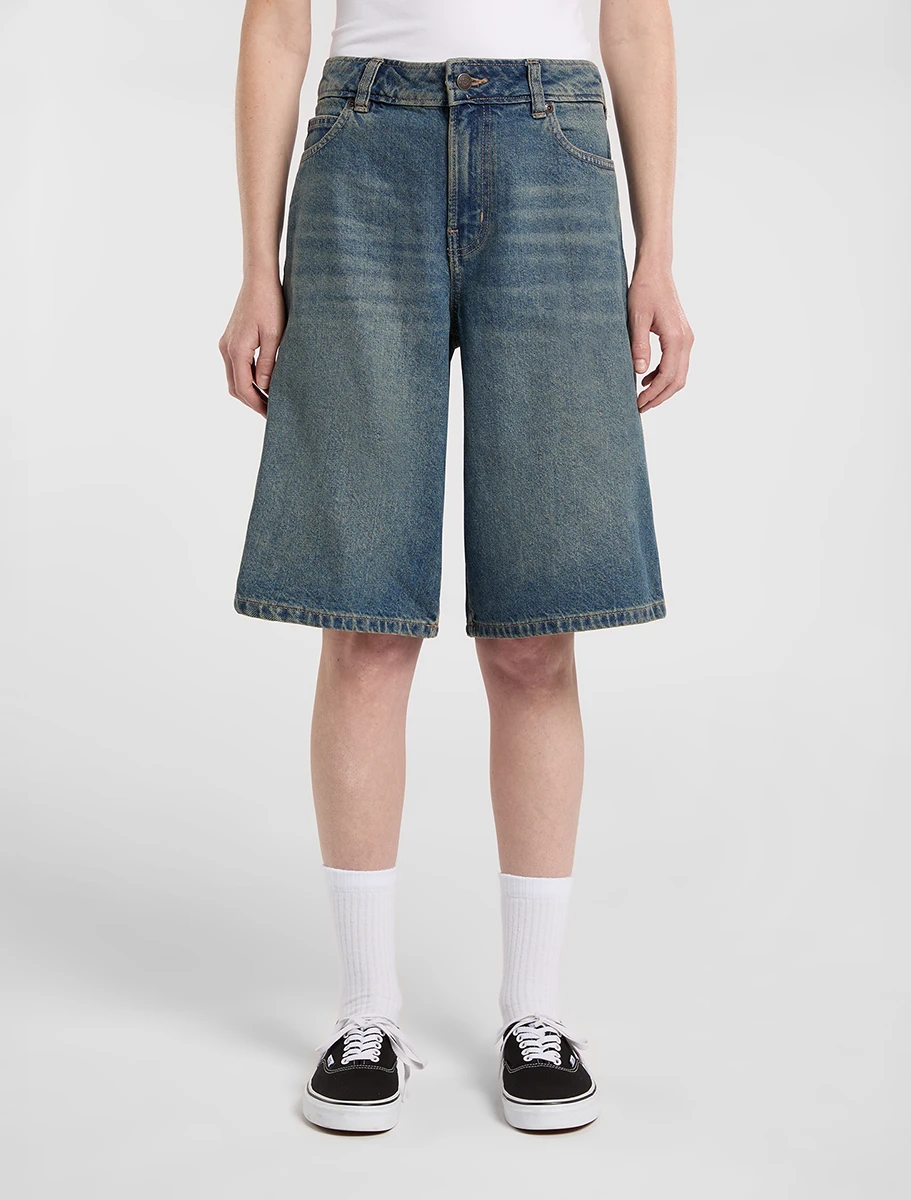 מכנסי ג'ינס קצרים נשים DENIM SHORT הוא מכנס ג'ינס בגזרה רחבה, גובה מותן בינונית ועיצוב רגל רחב. עשוי בד ג'ינס כותנה 14oz לנוחות ועמידות לאורך זמן. הדגם כולל מבנה קלאסי של חמישה כיסים עם תווית Dickies ארוגה על כיס הפאץ' האחורי, רוכסן וסגירת כפתור, וגם כיס צד לטלפון או כלי עבודה בצד ימין. מכנס נוח ומלא סטייל, עם תחושה וגזרה מודרניים.