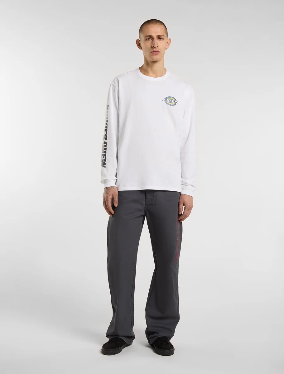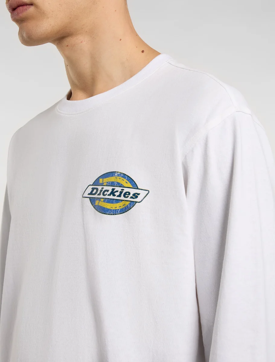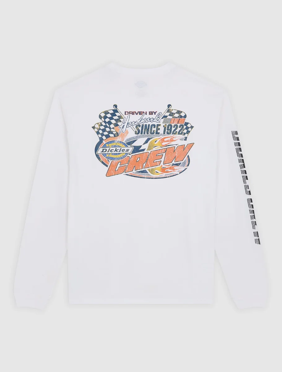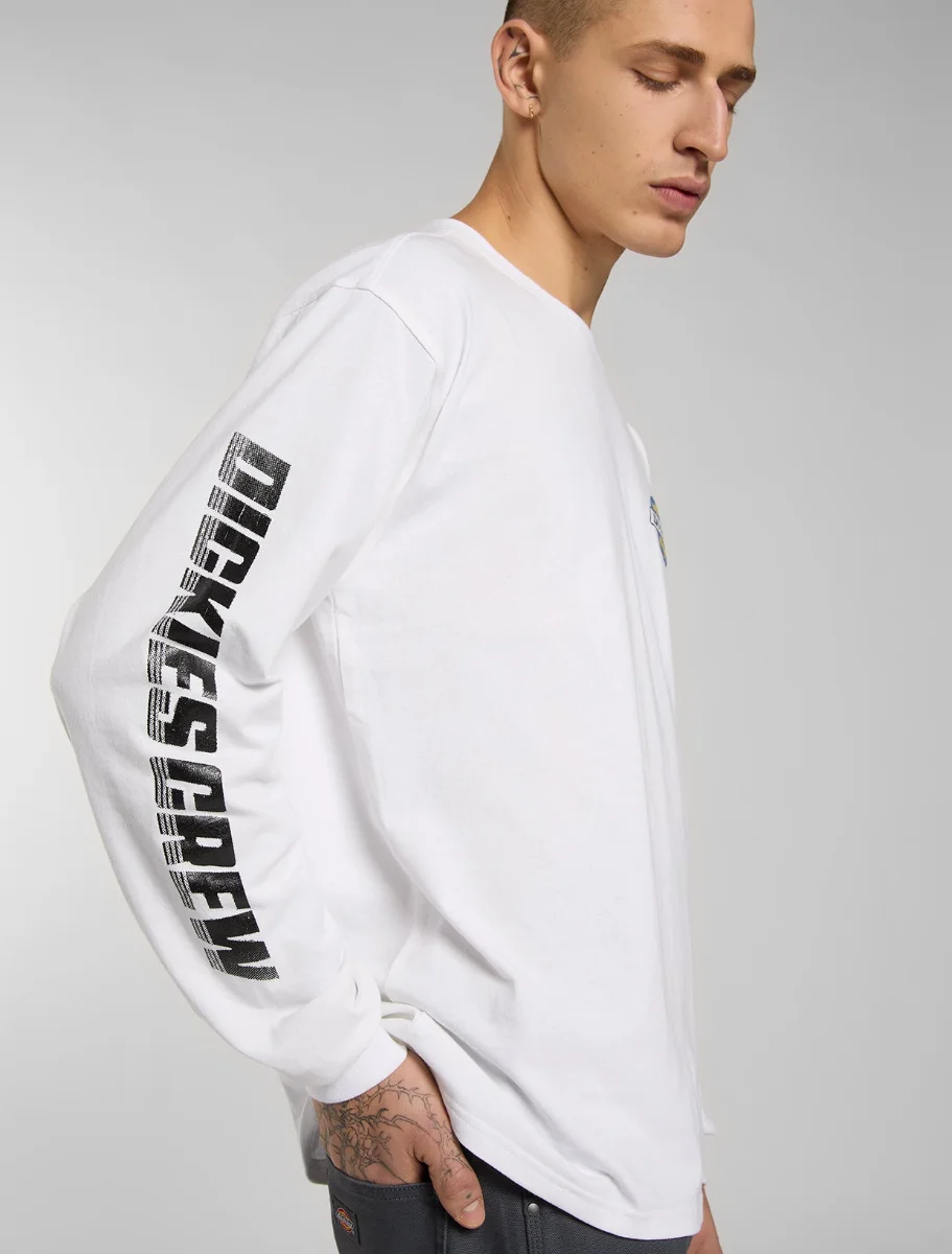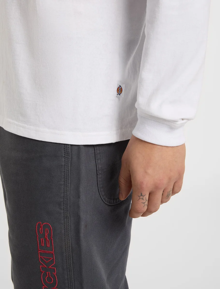 הדיטיילס שלה כוללים: גרפיקה של Dickies Icon בצד שמאל של החזה, הדפס גדול בגב בסטייל של צוות מרוצים, הדפס שרוול, ותווית Dickies ארוגה בתפר הצידי. זו חולצת שרוולים ארוכים חזקה ועמידה ונוחה לשימוש יומיומי.